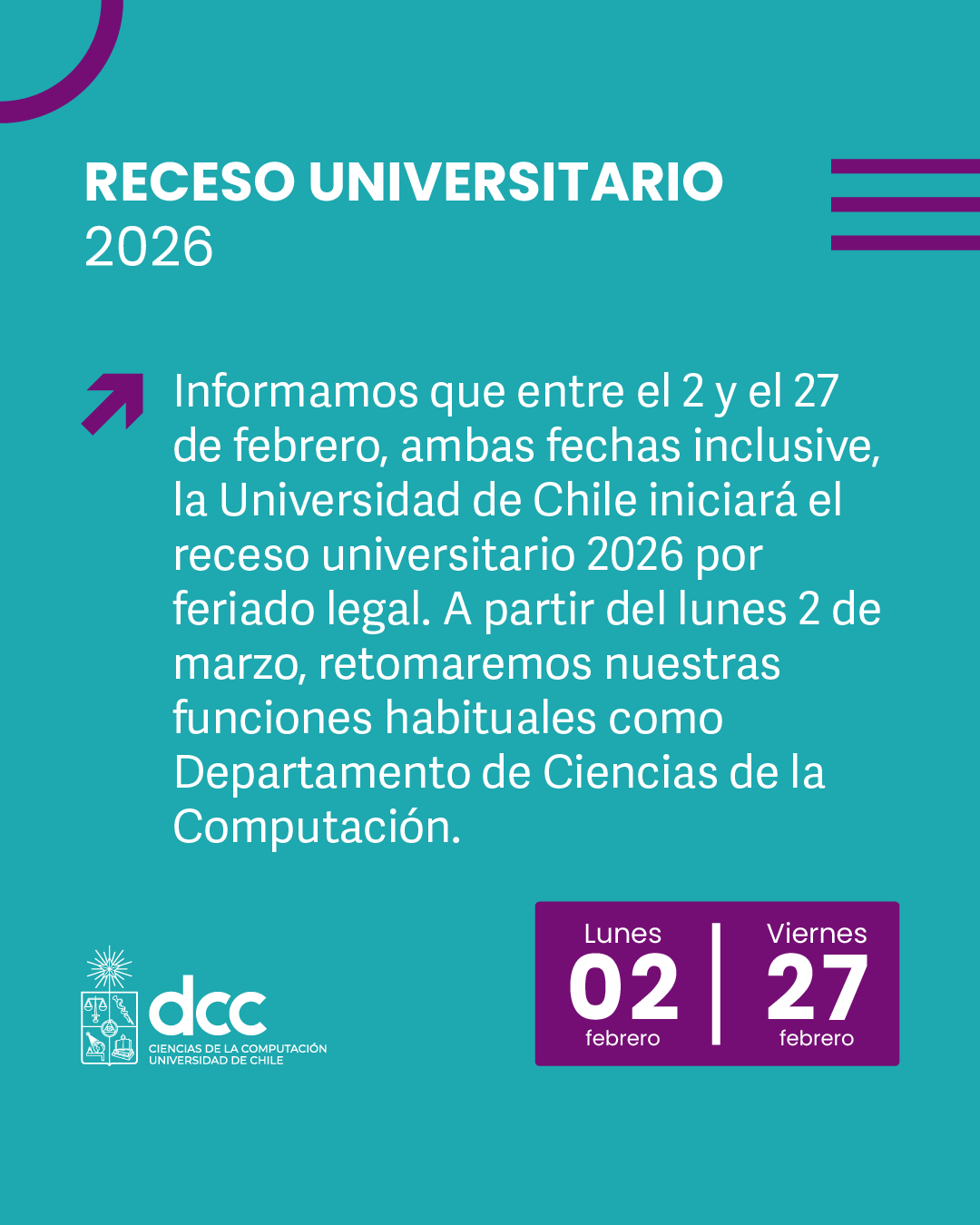 Informamos que entre el 2 y el 27 de febrero, ambas fechas inclusive, la Universidad de Chile iniciará el receso universitario 2026 por feriado legal. A partir del lunes 2 de marzo, retomaremos nuestras funciones habituales como Departamento de Ciencias de la Computación.
